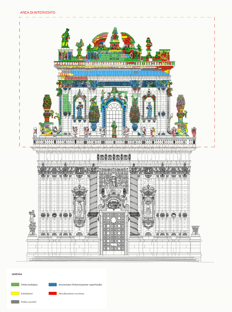 I lavori di restauro hanno riguardato la porzione superiore della facciata, zona maggiormente esposta all’azione degli agenti atmosferici e quindi più compromessa. È stata eseguita la messa in sicurezza di numerosi elementi pericolanti della decorazione lapidea a rischio di distacco e caduta con una perdita della qualità estetica e formale dell’opera. Si è trattato quindi di interventi preliminari ad un consolidamento strutturale volti a risolvere le situazioni di maggiore criticità e urgenza.